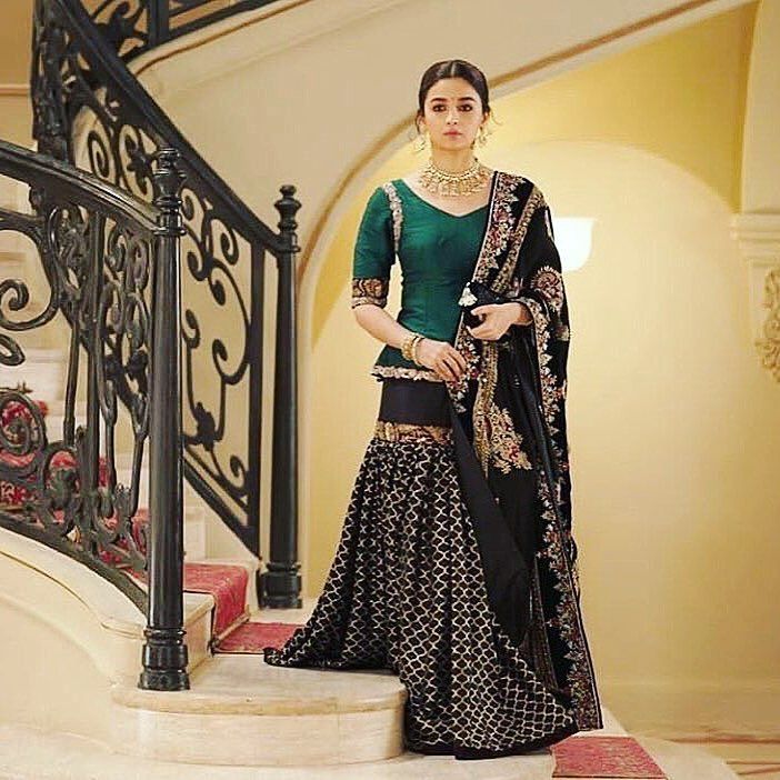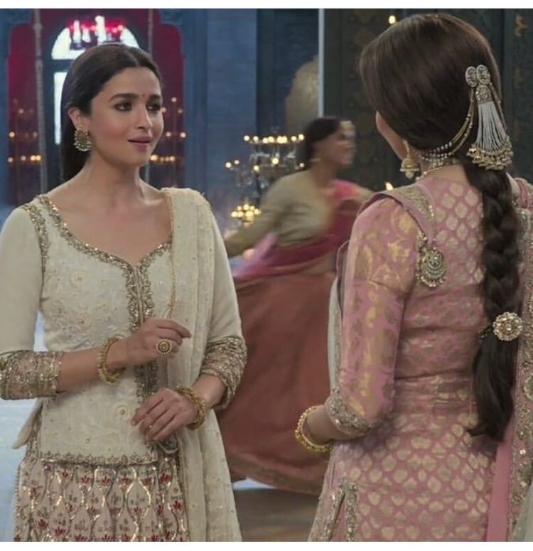 Her look in the song ‘Ghar More Pardesiya’ was the one where she was seen wearing a pastel pink and blue Pakistani Gharara which is quite flowy at the bottom and has been paired with short full- sleeved kameez/kurti and a dupatta tucked on the shoulders with an ornate pin taken in a U- shape on the front in such a way that it does not hinder the beautiful repeated gold print on the pastel pink base. There is also a lot of use of different types of embroideries including the Zari-Zardozi to accentuate the look of the Gharara and the bold border of the dupatta and the kurti. Also the intricate version to Bahaar Begum’s ghararas and shararas has been given by incorporating a bit of a Sozni, Kashmiri and Persian touch. Her makeup has been done in such a way that makes her look much more experienced and mature whereas Alia Bhatt’s character as Roop has been shown as a young face with a subtle and muted makeup.