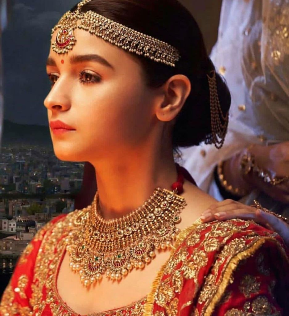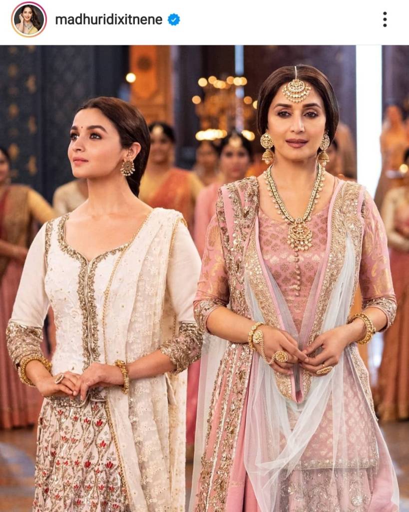 Talking about the jewellery of both Alia Bhatt and Madhuri Dixit in this particular song ,as mentioned earlier Bahaar Begum’s character played by Madhuri Dixit always wears rich jewellery and over here her look has been completed with gold Rani haar embellished with Kundan and Pearls, heavy Chandbalis, Maang tika and adding to it the beautiful ornate rings or hathphool and heavy gold bangles. She has kept braided hair and a beautiful juda pin attached with her earrings through a number of strings which is called Maharani juda pin and is an exceptional accessory. On the other if we look at Alia Bhatt in the same song she also has braided hair and an ornate pin attached in the middle of her hair at the back but the jewellery is very minimalistic involving some Chandbalis and an ornate ring in on hand and gold bangles in both hands. The neck has been kept empty to draw focus towards the beautiful embroidered neckline of the short kurti that Roop (Alia Bhatt) is wearing. There is also a small bindi on Alia Bhatt’s forehead because she is now married to Dev Chaudhary whereas Bahaar Begum remained unmarried throughout her life, so there is not bindi on her forehead.