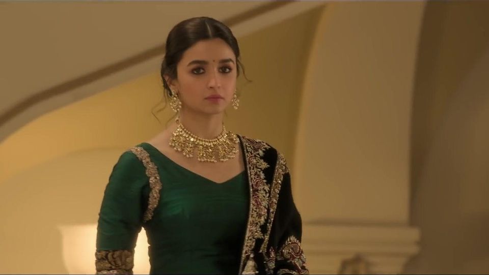 This particular bottle green sharara is also one of the outfits that I loved and we got to see a different look of Alia Bhatt with the hair turned into a bun and jewellery including a gold choker set embellished with kundan and pearls and Chandbalis. The sharara is paired with usual fitted satin silk short kurti having one-fourth sleeves There is also this very Kashmiri and old world embroidery reminiscent of Persia that could also be observed in various outfits throughout the movie. In the movie overall the colour palette is very muted and understated except for few special occasions. The outfits have been made believable to what were used in those times. cotton, vegetable dyes, chikankari, mulmul and net has been used.