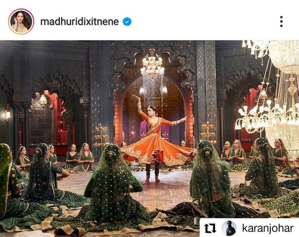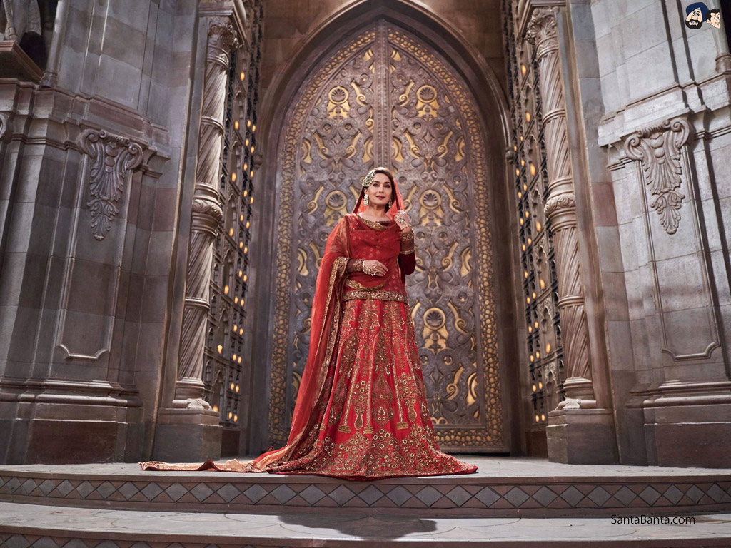 This song was the one where there is a depiction of two parallel worlds of Zafar on one hand and Roop getting married to Dev Chaudhary and we are introduced to the place of Heera Mandi and the people living there as well as their lifestyle and we suddenly see Madhuri Dixit coming out from the place where she teaches singing and dancing. As you can see the frame consists of Bahaar Begum( Madhuri Dixit) in the center in a deep red ghagra with full sleeved choli covered with butta block print design. There is a lot of old world gold embroidery all over the ghagra and floor length heavy dupatta taken over her head with nazakata. The way her fingers are holding the dupatta from one end gives the feel of how women were shown in the miniature paintings. The crisscross hathphool has been designed in such a way that it covers the entire hand. Also to complete the look has been paired a heavy passa jewellery and Chandbalis. There is also a grand old world setting behind her,the big doors and pillars.