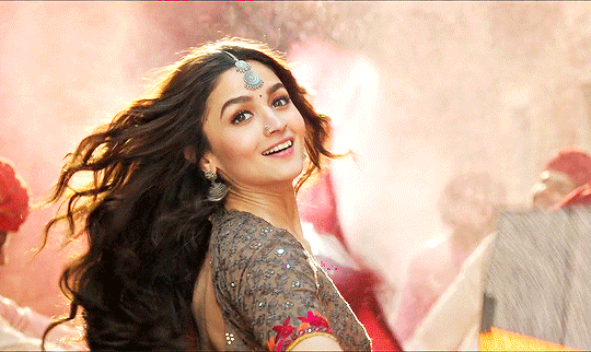 Initially Roop has been shown running behind a kite in her hometown in Rajasthan. she was a young and free girl roaming from one place to another. So as you can see she has her hair open flying in the air beautifully and throughout the movie there was a subtle makeup and because Alia Bhatt’s character goes through different phases . Initially there is also this romantic phase where we see her in more lighter shades and pastels but then there is a more intense phase where she picks up deeper shades. This outfit for instance was intentionally created to look like a typical Rajasthani ghagra Choli with bright coloured borders, mirror work, swatches of famous Rajasthani embroidered bright pieces lined at different places to support the brownish ghagra choli paired with set of oxidised jewellery consisting of Maang tika and jhumkas famous in Rajasthan.